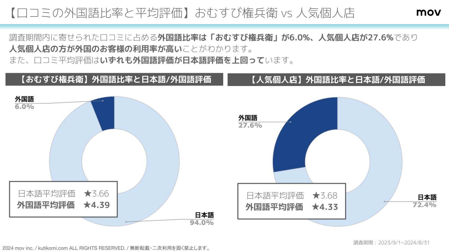 調査期間内に寄せられた口コミに占める外国語比率は「おむすび権兵衛」が6.0%、人気個人店が27.6%であり人気個人店の方が外国のお客様の利用率が高いことがわかります。また、口コミ平均評価はいずれも外国語評価が日本語評価を上回っています。