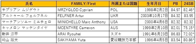 男子やり投には、世界大会に4度出場した新井涼平(スズキ)やブダペスト世界選手権日本代表の﨑山雄太(愛媛競技力本部)がエントリーしています。