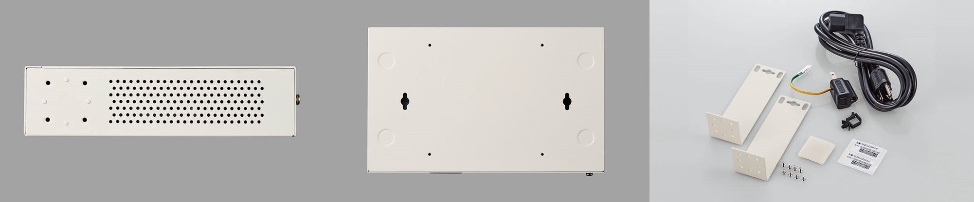 付属の金具を使った19インチラックマウント、別売のマグネットを使った金属面への取り付け、底面の取付穴を使った壁面設置なども可能です。