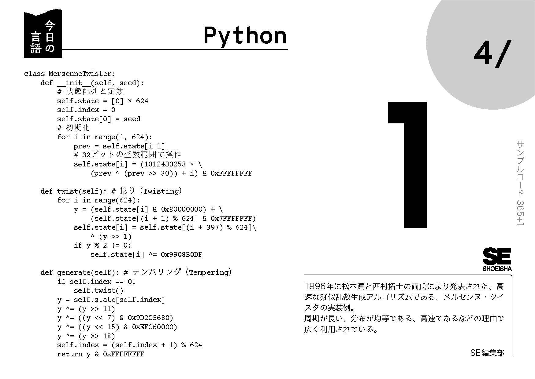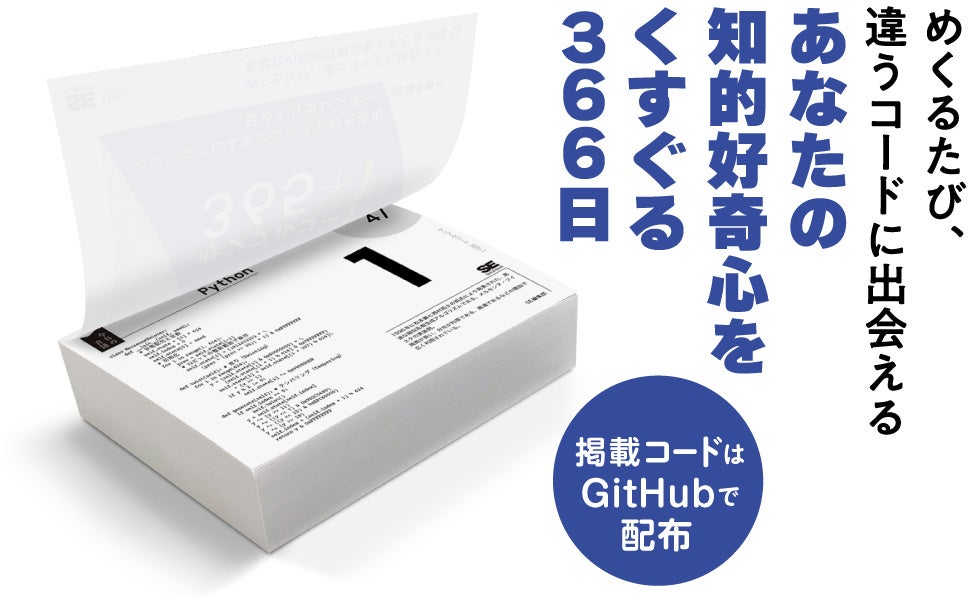 読者の皆さまからの公募と編集部が作成したサンプルコードを中心に、PythonやJavaScriptといったよく使っている言語から、名前だけは知っている言語、まったく知らなかった言語まで、机の片隅や棚の上で、366日毎日新しいコードに出会えます。日付のみのカレンダーなので、何年でも使うことができます。また、掲載コード等はGitHubで配布しています。
