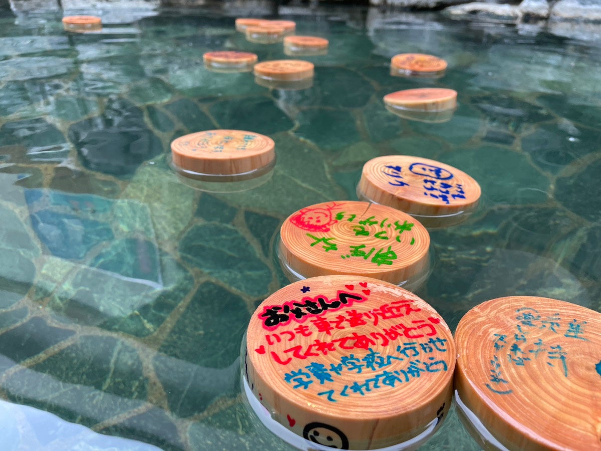 お父さんへの「ありがとう」の気持ちを記したヒノキの⼊浴⽊を99個を男性露天風呂に浮かべます。残り1つのありがとうのメッセージは、お客さまから⼤切な⽅へ直接伝えてください。イベントで使う⼊浴⽊には間伐材を使⽤。温泉道場は「おふろから文化を発信する」を企業理念に掲げており、間伐材の積極的活⽤を通じて、地域の森林整備についても意識する機会になればと考えております。