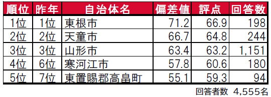 トップ3は、安定した評価の高さで3年連続同じ顔ぶれとなっています。4位は、県中央に位置し、さくらんぼの産地として知られる寒河江市、5位は、県南東に位置する農業が盛んな東置賜郡高畠町です。