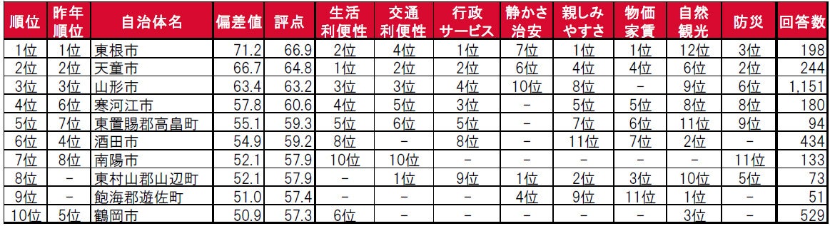- 街の住みここちランキング2022<山形県版>自治体TOP10 因子別順位