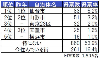 2年連続で1位は宮城県仙台市、2位は山形県山形市です。昨年は東北の自治体のみを対象として集計していましたが、今年は全国の自治体を対象とした結果、3位に東京23区、5位には神奈川県横浜市がランクインしています。