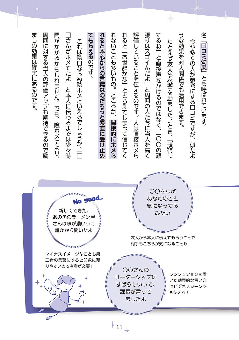 『NOメリットで相手に親切にしたら"好意の返報性"で100%親切が返ってくる』『悪口を言ってくる人には"自己開示の法則"で距離を縮めると悪口を言われなくなる』など、誰とでもコミュニケーションがうまくいくちょっとした心理テクニックが満載です。