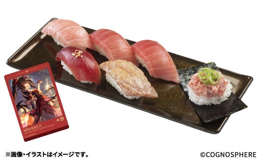 また、コラボ限定クリアボトル(前半4種、後半4種)付きのソフトドリンクや、コラボ限定メタリックカード(前半4種、後半4種)付きの「天然インド鮪6貫盛り」、コラボ限定すし皿(前半4種+シークレット1種、後半4種+シークレット1種)付きのお持ち帰りセットもご用意いたします。さらに、アクリルコレクションカードが当たるSNSキャンペーンも実施いたします。