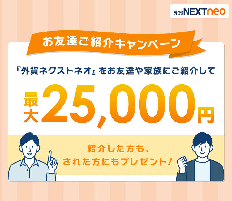 すでに『外貨ネクストネオ』を開設しているお客様(「ご紹介者様」)が、『外貨ネクストネオ』に興味をお持ちの方(「お友達」)を紹介していただき、後日その「お友達」が条件(『外貨ネクストネオ』にて10万円以上の入金(※1)、および1万通貨以上の新規取引を5回以上)を満たされた場合には、「ご紹介者様」と「お友達」の双方にもれなく現金5,000円をプレゼントいたします。
