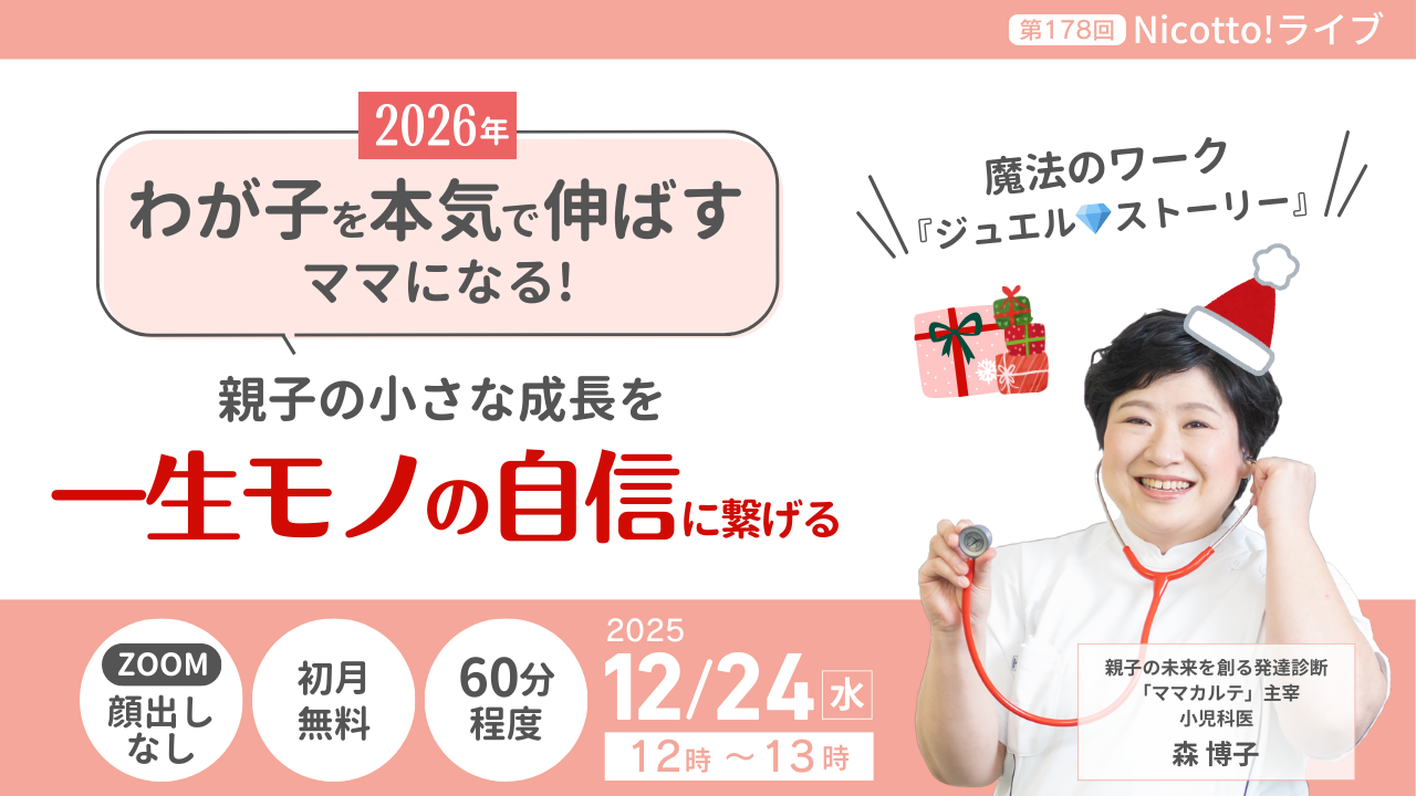 (株)パステルコミュニケーション(本社:東京都豊島区、代表取締役:吉野加容子)が運営する、発達障害・グレーゾーンの子どもを育てるママがいつでも学べて相談できるオンライン子育て塾「Nicotto!塾」は、2025年12月24日(水)お昼12時より、「わが子を本気で伸ばすママになる!親子の小さな成長を一生モノの自信につなげる魔法のワーク」をテーマにオンラインライブを開催いたします<https://desc-lab.com/nicotto202201/?prt1224>