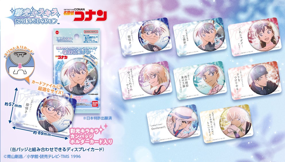株式会社バンダイ ライフスタイル事業部では、直径約57mmのキャラクターを美しい彩(いろどり)で光り輝かせるオリジナルの「彩光」アレンジイラストが美しいキラキラ缶バッジと缶バッジホルダーカードがセットになった新しい国産の缶バッジのコレクションブランド『彩光キラキラ缶バッジコレクション』より、「彩光キラキラカンバッジコレクション 名探偵コナン」を2025年4月下旬より全国のアニメイト他にて順次発売開始いたします。