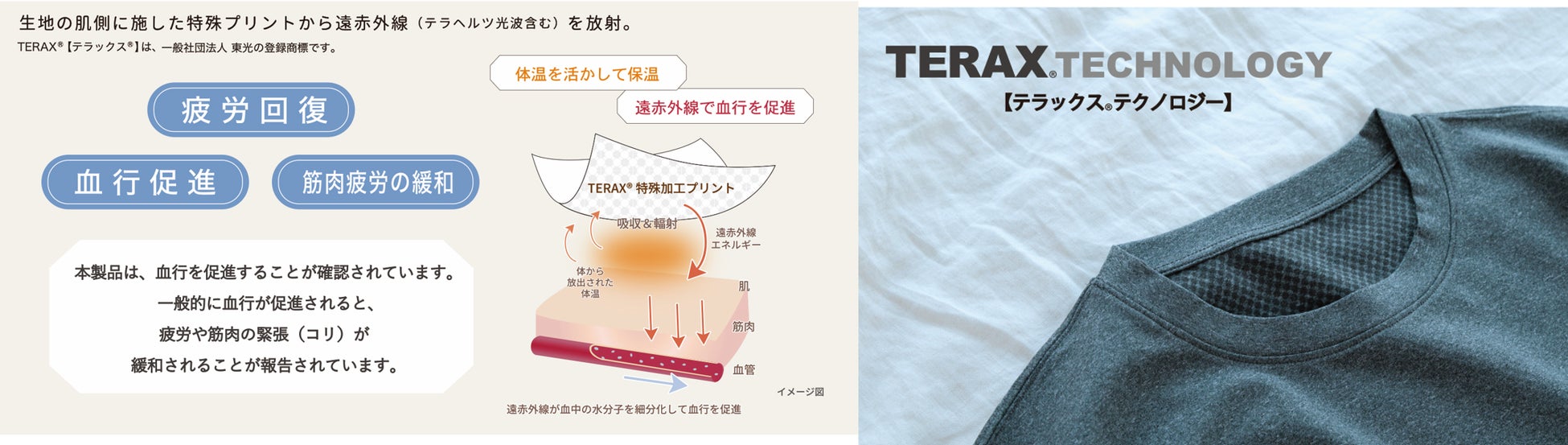 遠赤外線を効率的に放出する人工鉱石を配合した素材技術。この素材が体から出る遠赤外線(テラヘルツ波を含む)を吸収し、再度放射することで血行促進などの効果が期待できます。TERAX® は一般社団法人 東光の登録商標です。