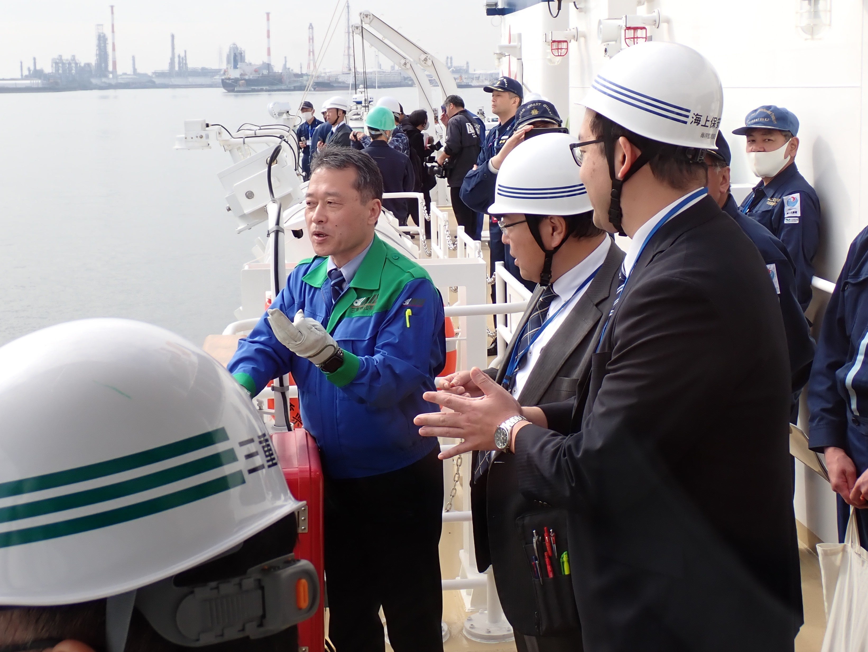訓練では、船内に災害対策本部を設置し、学生ホールや事務室、操舵室を活用した「洋上対策本部」としての運用を確認しました。また、四日市海上保安部の巡視艇「あおたき」と連携し、伸縮クレーンを用いた緊急物資輸送訓練を実施しました。
