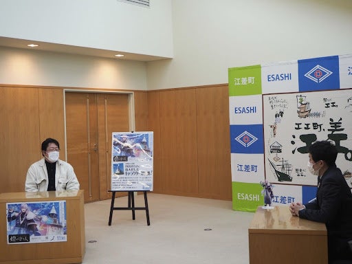 燈の守り人キャラクターを活用して、地域の灯台を歴史・文化資産として活用する機運をつくるため、キャラクター化の対象となる「鴎島灯台」が立地している北海道江差町の照井誉之介町長を、「燈の守り人」製作委員会プロデューサーの柴田英知が2022年2月21日(月)に表敬訪問し、キャラクターの贈呈式を実施しました。