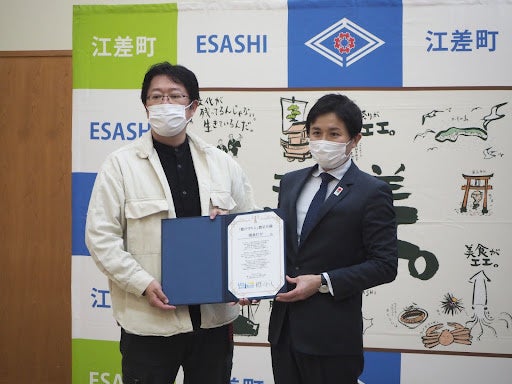 北海道江差町「鴎島灯台」を擬人化したキャラクターが完成!「燈の守り人」製作委員会プロデューサーが照井誉之介町長を表敬訪問しキャラクター贈呈式を実施しました