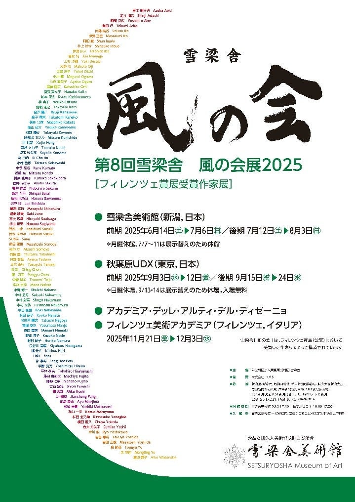 今展では、89名の風の会メンバーが参加し、前期と後期に分けて展示いたします。雪梁舎美術館のほか、秋葉原UDXにて東京巡回展も開催いたします。また、この中から64名の作家の作品をフィレンツェに送り、フィレンツェ美術アカデミアの選抜学生の作品とともに展示いたします。