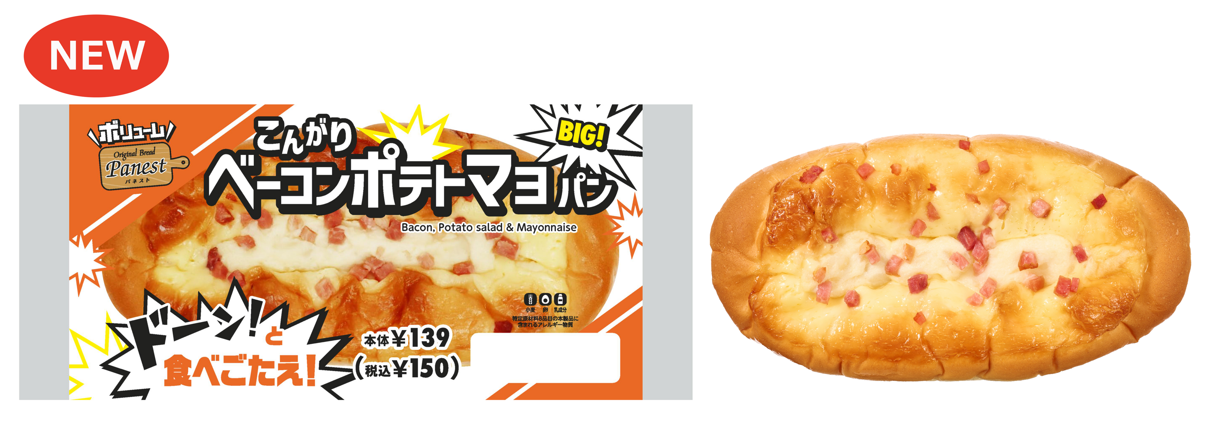 ドーン!と食べごたえ!ふんわりとした生地にマヨネーズとポテトマヨを絞り、ダイスベーコンをトッピングしました。ベーコンとポテトの食べごたえで大満足!