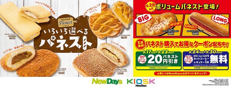 NewDays、NewDays KIOSKで展開するパンのオリジナルブランド「Panest(パネスト)」は“最上級のパン(Pan+est)” をコンセプトに掲げ、年間約200種類を発売、販売開始以来トータル4億7千万食を突破し、たくさんのお客さまに愛されてまいりました。人気商品のリニューアルに加え、新作5品、ワンランク上のおいしさをお届けする「ごほうびパネスト」新作3品、さらに新シリーズ「ボリュームパネスト」2品を発売します。盛りだくさんなラインナップで「いろいろ選べるパネスト」キャンペーンを店頭ポスターやPOPで訴求します。