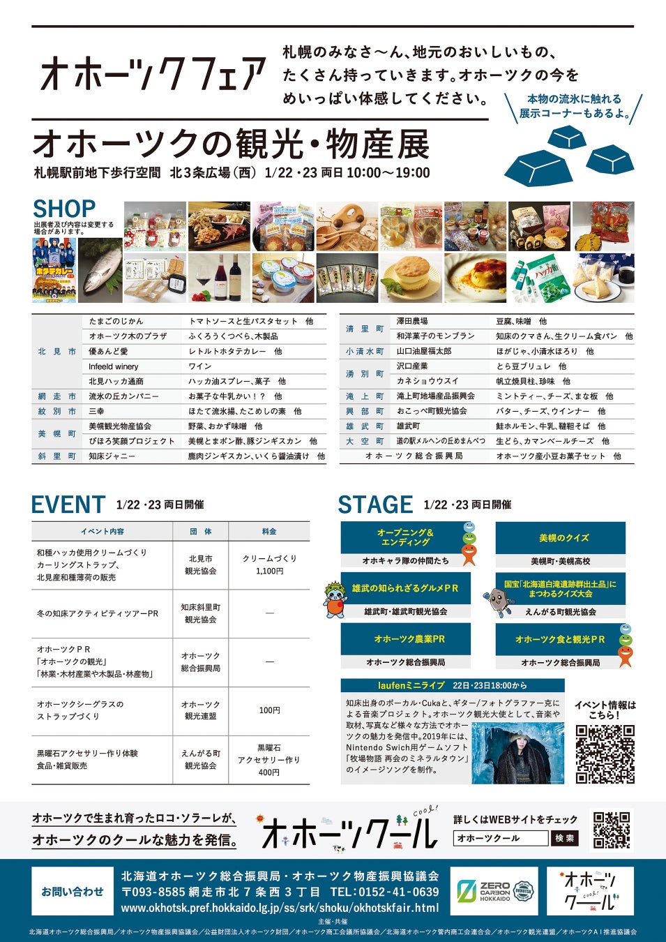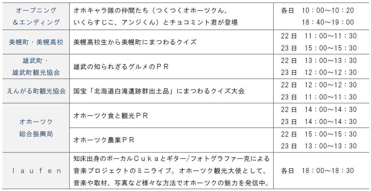 やクイズ大会のほか、オホーツク観光大使の“laufen”のミニライブを開催します。