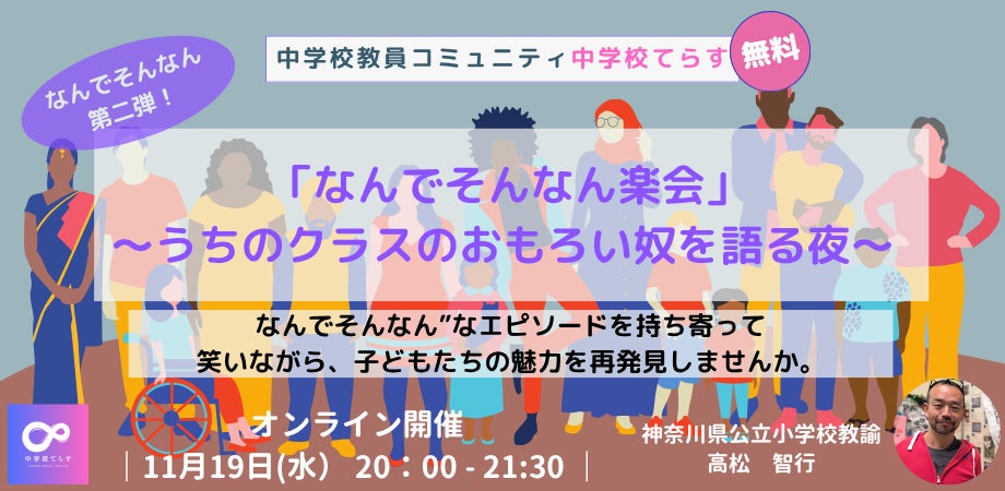 株式会社NIJIN(本社:東京都江東区、代表取締役:星野達郎)が運営する「中学校てらす」は『続「なんでそんなん?第二弾」 「なんでそんなん楽会」〜うちのクラスのおもろい奴を語る夜〜』を開催します!