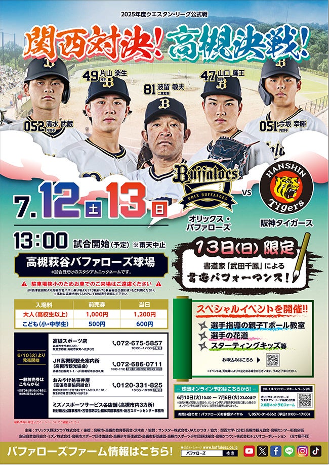 令和7年7月12日(土曜日)・13日(日曜日)に高槻市の高槻萩谷バファローズ球場(萩谷総合公園野球場)で、オリックス・バファローズと阪神タイガースのプロ野球ウエスタン・リーグ公式戦を開催。リーグ覇権奪回を目指す両チームで1軍に昇格するために日々練習に励む2軍選手たちによる熱戦が繰り広げられます。試合終了後には当日参加可能のベースランニング、バファローズ選手のサイン会などお楽しみイベントも。ぜひご参加ください。