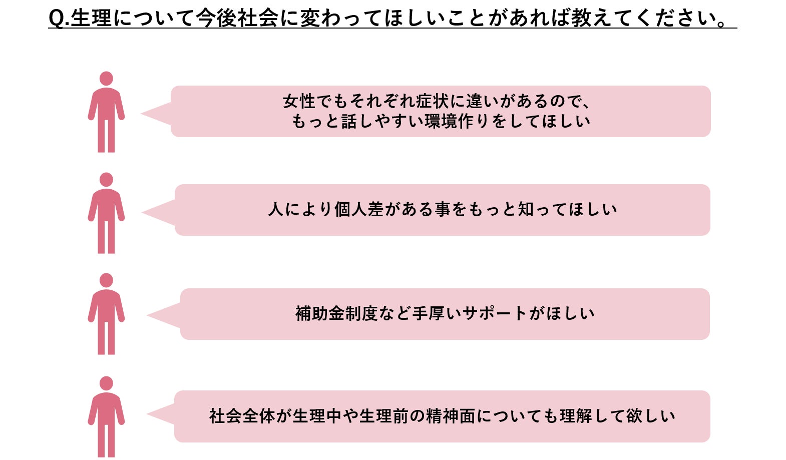 最後に、“生理について今後社会に変わってほしいこと”について「女性でもそれぞれ症状に違いがあるので、もっと話しやすい環境作りをしてほしい」「女性も男性も、生理への理解を深めてほしい」「人により個人差がある事をもっと知ってほしい」などの声が上がりました。