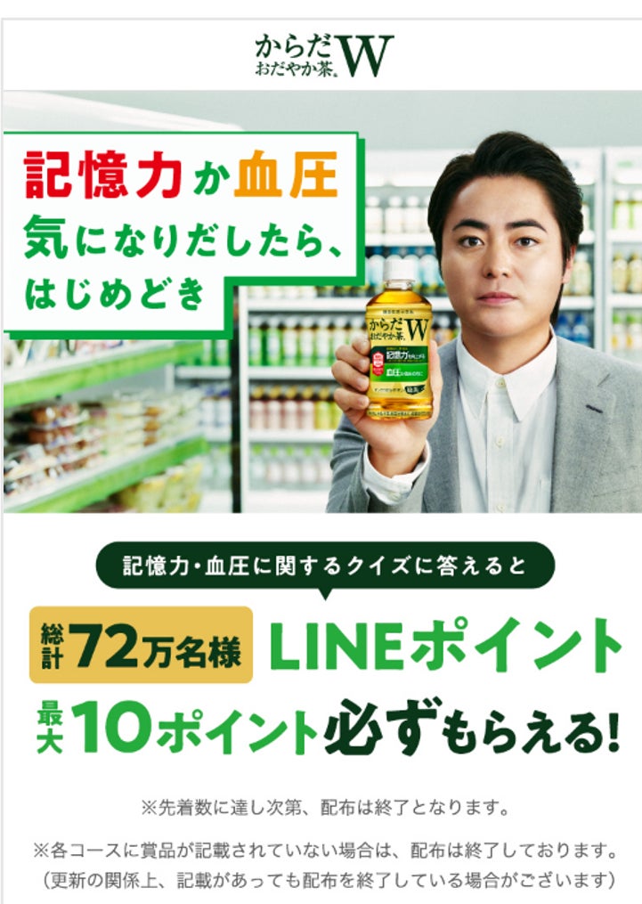 「からだおだやか茶W」は、リニューアル発売に合わせて、自分の記憶力や血圧への知識を試すことができるデジタルキャンペーンを実施します。キャンペーンに参加した方の中から先着72万名様にLINEポイント最大10ポイント必ずもらえる※3キャンペーンとなっています。第1弾は記憶力チャレンジで、2月28日から公開予定。第2弾の血圧クイズは、3月24日より公開予定です。
