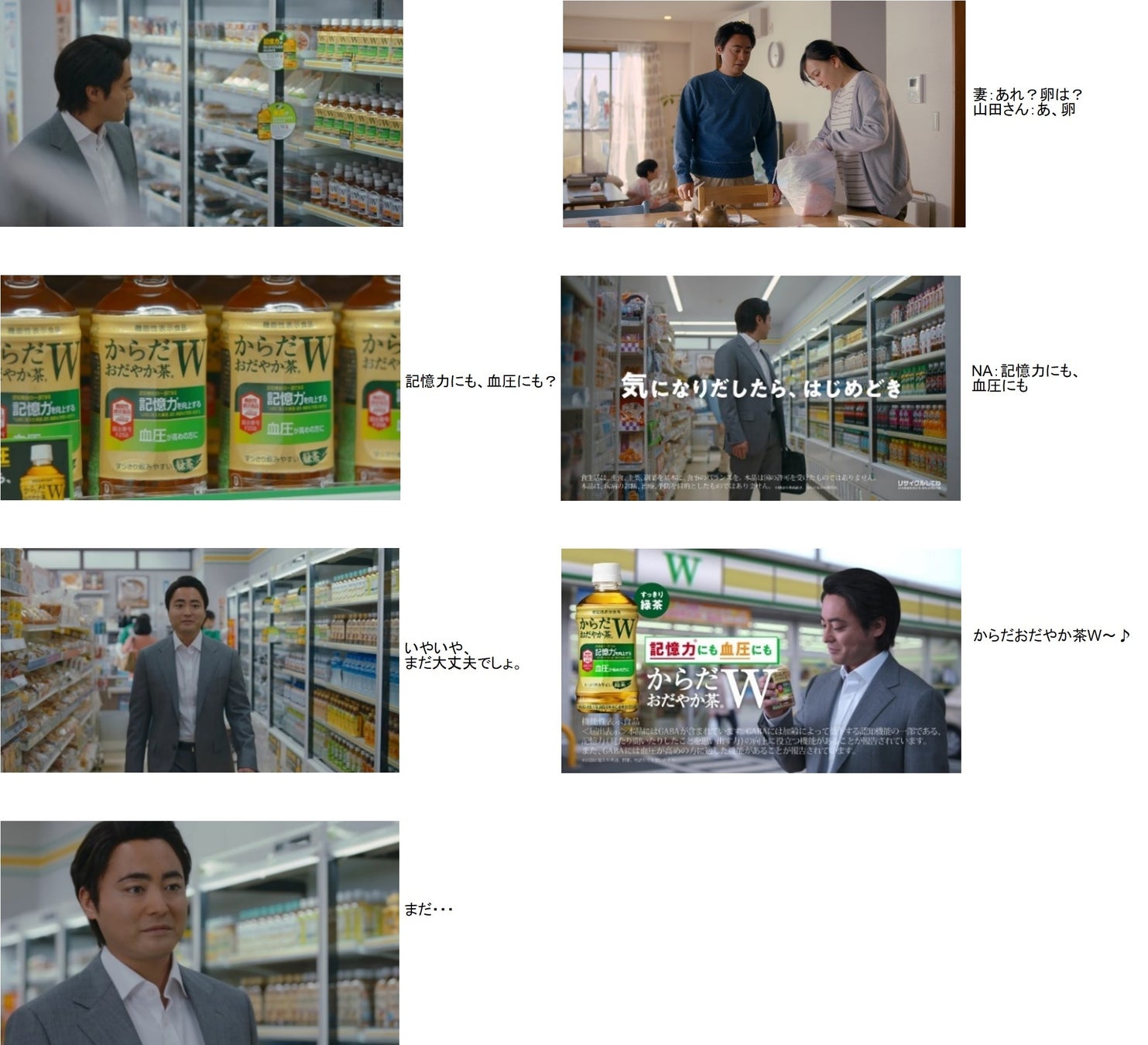 とあるコンビニエンスストアの店内を見て回る仕事帰りの会社員・山田さん。ふと、棚におかれた記憶力にも血圧にもWではたらく、「からだおだやか茶W」が目にとまります。記憶力も血圧もまだ大丈夫だから関係ないと一度は素通りする山田さんですが・・・ふと思いを巡らせると何やら心当たりがあったようです。結局、棚まで引き返して「からだおだやか茶W」を購入して、飲んで、ほっとひと息つくという様子を描いています。山田さんが回想するシーンで、頼まれていたものの買い忘れを思い出すしぐさと、ふと思い直して棚まで戻る表情づくりが見どころです。