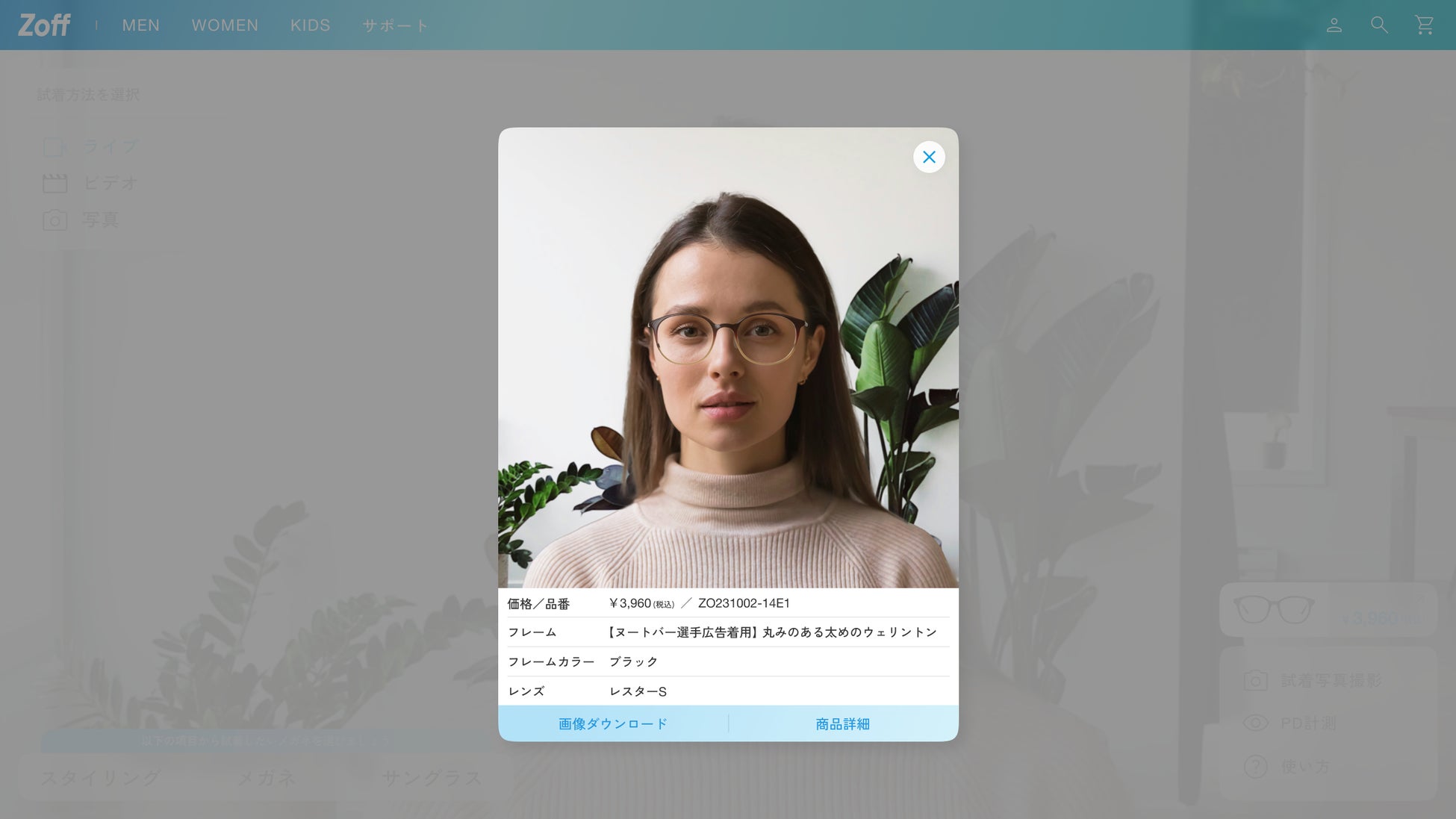 試着はLIVEモード、ビデオモード、写真モードから選択でき、試着イメージを撮影しダウンロードすることができます。画像には商品の詳細情報が記載されており、店頭やオンラインサイトでよりスムーズに商品を購入することが可能です。国内のアイウェアWEB試着サービスで「Live機能」「動画機能」「写真機能」をすべて揃えているのはZoffだけです。
