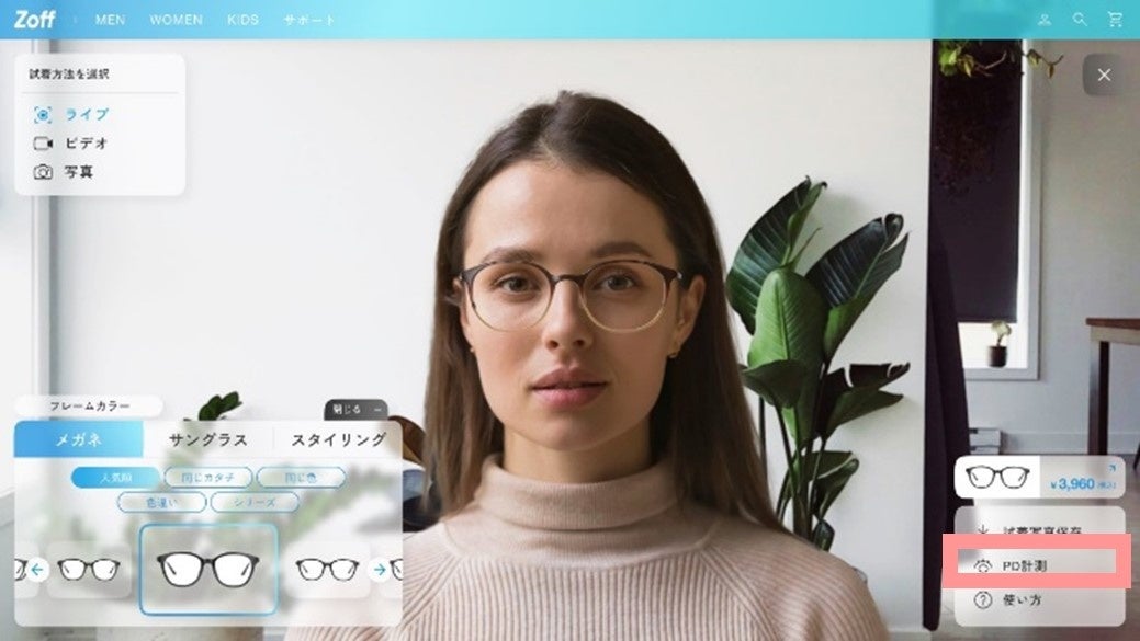 「Zoff EASee」はオンラインでメガネをバーチャル試着できるサービスです。目と目の間の距離を自動計測することにより、バーチャル上でも顔に対して実寸に近い形でのメガネ・サングラス試着を実現しました。また、好みのフレームやレンズカラーを選択することで、カスタムサングラスの試着を行うことができます。Zoff公式オンラインサイトで展開する、Zoffスタッフがプロ目線でお気に入りアイウェアを選ぶ「Zoffスタッフコレクション」のスタイリング画像から、お好みの組み合わせを見つけての試着も可能です。