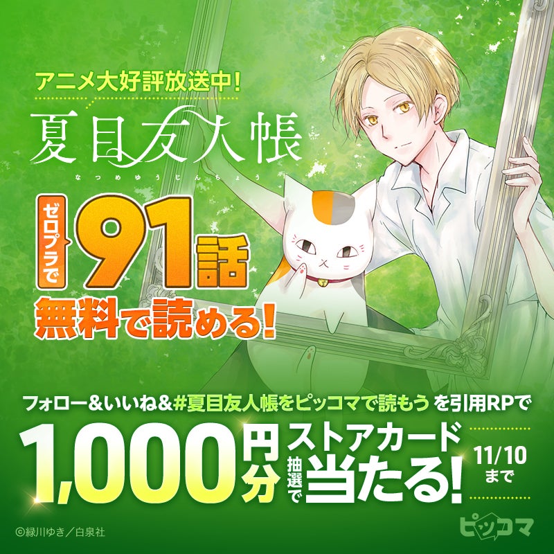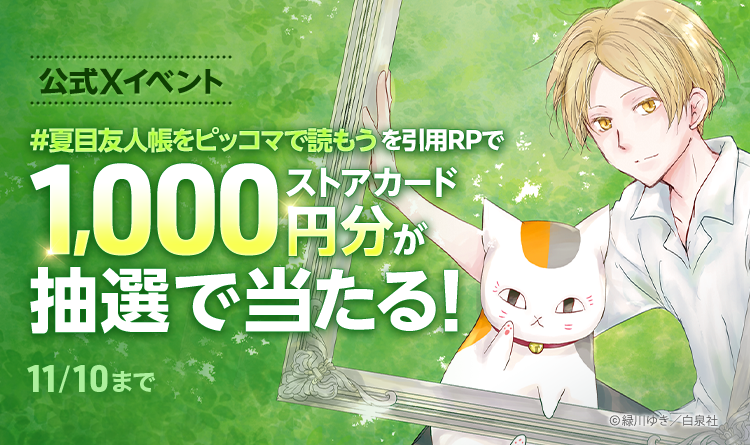 また、ピッコマでは、現在テレビアニメ第七期が放送中の『夏目友人帳』が「¥0+」適用中で、1話から91話(※1)まで、無料で読むことが可能です。ピッコマ公式X(https://x.com/piccoma_jp)では、本作品をより多くの人に読んで頂きたく、11/6(水)から11/10(日)まで、抽選でストアカード1,000円分が当たるチャンスのキャンペーンを実施いたします。参加方法は以下、もしくはピッコマ公式Xをご確認ください。