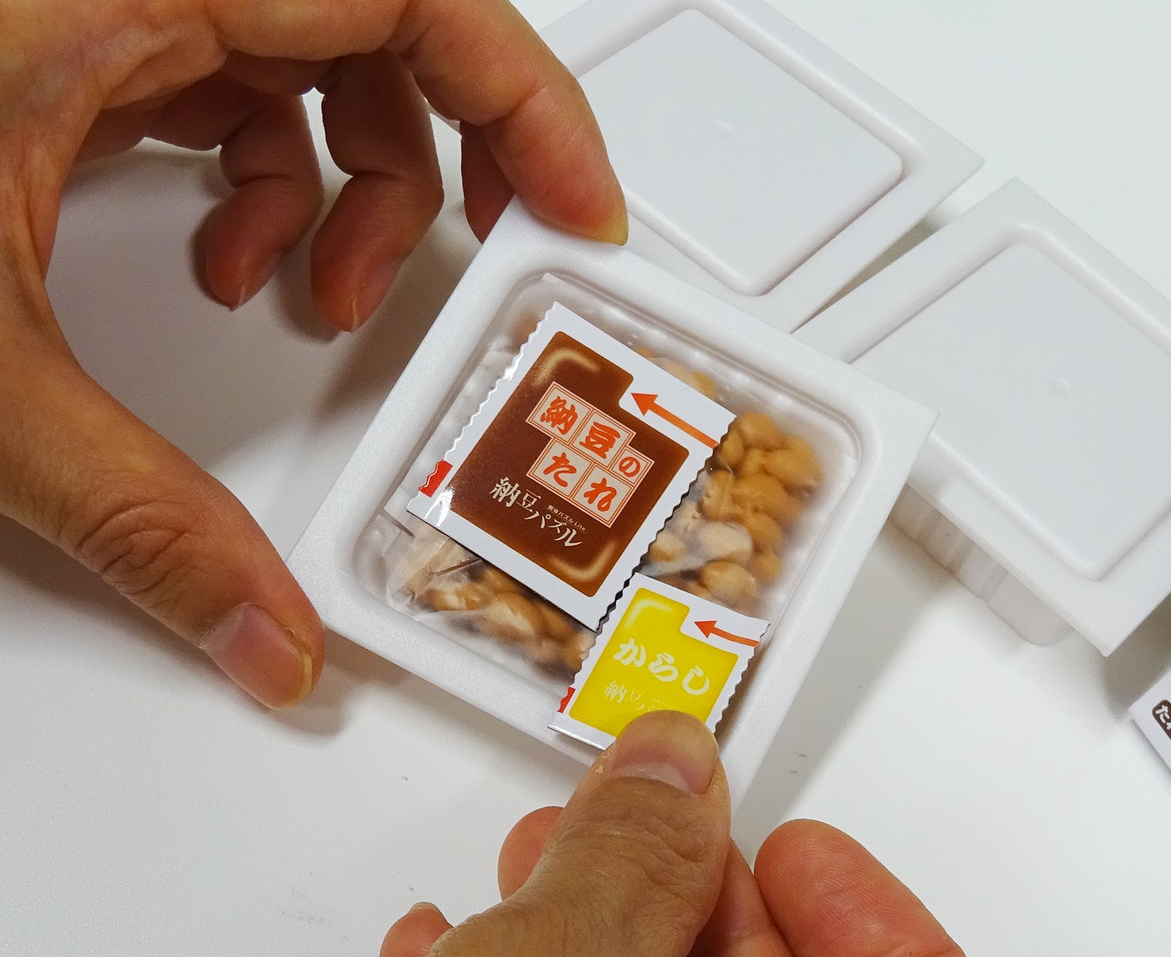 同商品は、容器に入っている納豆を完成させるパズルで、①6つの納豆パーツをうまく組み合わせて容器に入れる②フィルムとからしシートとたれシートを入れて蓋をする③容器を3つ重ねる④スリーブを巻く、この4つの工程で遊ぶことができます。納豆パーツは、正しい位置に入れないとふたが閉まらず、 容器も正しい順番で組み合わせないと重なりません。本物そっくりの造形と絶妙な難しさが特長の立体パズルをお楽しみください。
