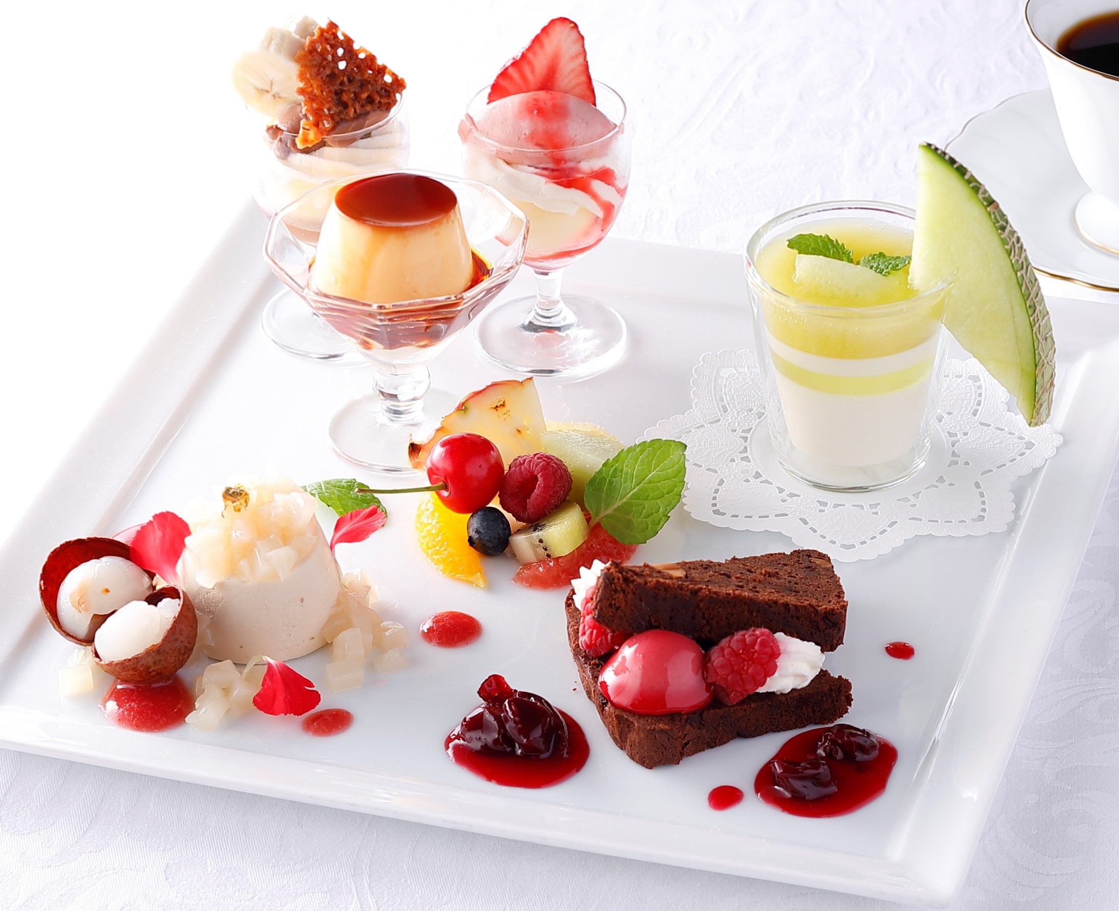 資生堂パーラー定番のストロベリーパフェ、チョコレートパフェ、カスタードプリンに、月替わりで季節のデザートをご堪能いただけるバリエーション豊かで贅沢なプレートです。