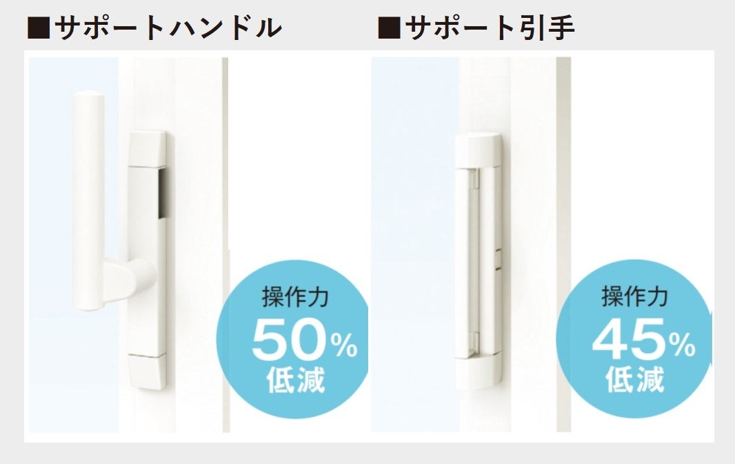 ガラスの複層化・トリプル化によるガラス枚数の増加や気密性の向上など、窓の性能向上に伴う重量化が課題でした。そこで、窓の開閉時に感じる重みを軽減するため、開閉サポート機能を搭載したオプション部品として「サポートハンドル」と「サポート引手」を用意しています。