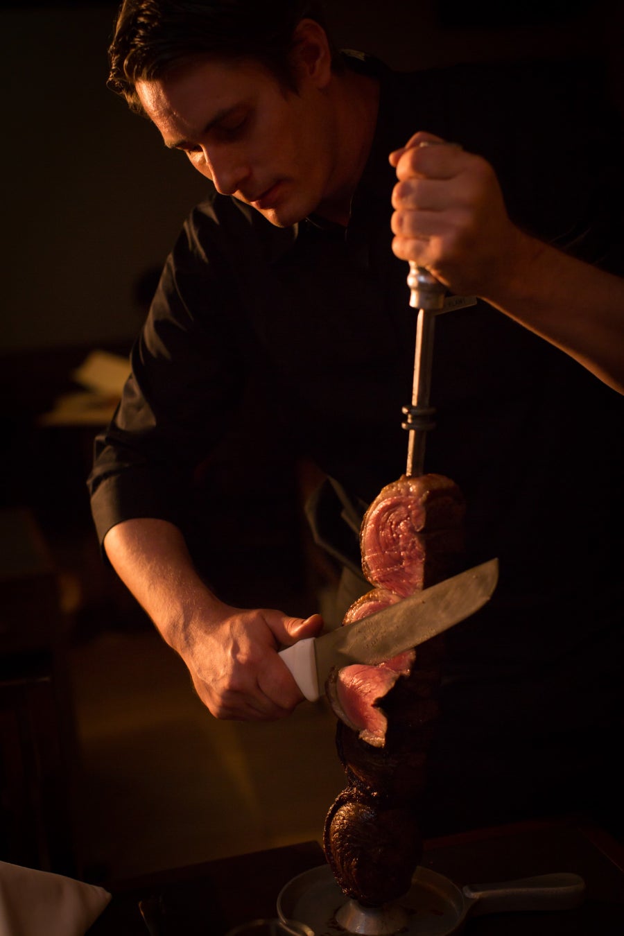 シュラスコとは、ブラジリアンバーベキューのことです。塊のまま串に刺し岩塩のみで焼き上げたジューシーなお肉を、「パサドール」と呼ばれるスタッフがそのままの状態でテーブルまでお持ちし、お客様の目の前でお好きな部分をお好きなだけ切り分けてご提供するスタイルのバーベキューです。岩塩のみのシンプルな味付けで、油を一切使わずに焼き上げる為、肉の余分な脂も落ちてとてもヘルシーです。