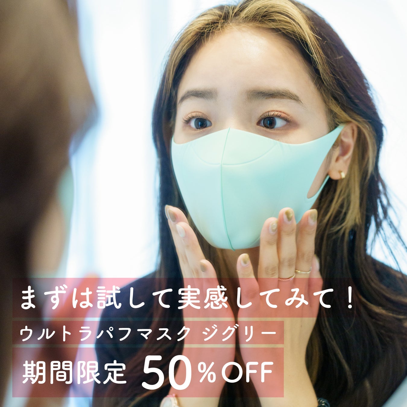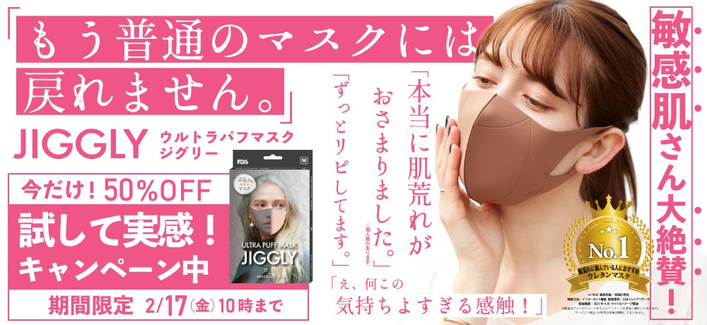 お肌にやさしい「ウルトラパフマスクJIGGLY」は、多くのお客様から「え、何この気持ち良すぎる感触!」、「そこらで売っているマスクとは全く別物のぷるぷる感触」などと高評価を頂いております。また、長いマスク生活による肌荒れで悩まれていた方からは、「これを着けたら他のマスクは使えない!」との嬉しいお声も寄せられています。そこでこの度、毎日のマスクによる肌荒れで悩んでいる多くの皆様に、「まずは試して実感していただきたい!」という想いから、『JIGGLYお試しキャンペーン』を開催する運びとなりました。