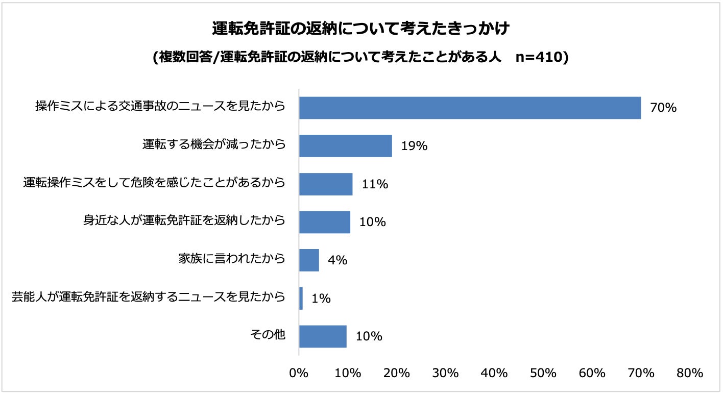 運転免許証の返納について考えたきっかけは、「操作ミスによる交通事故のニュースを見たから」が7割でダントツでした。「その他」では、「視力の低下」や「運転していると疲れてしまう」などの回答も見られました。