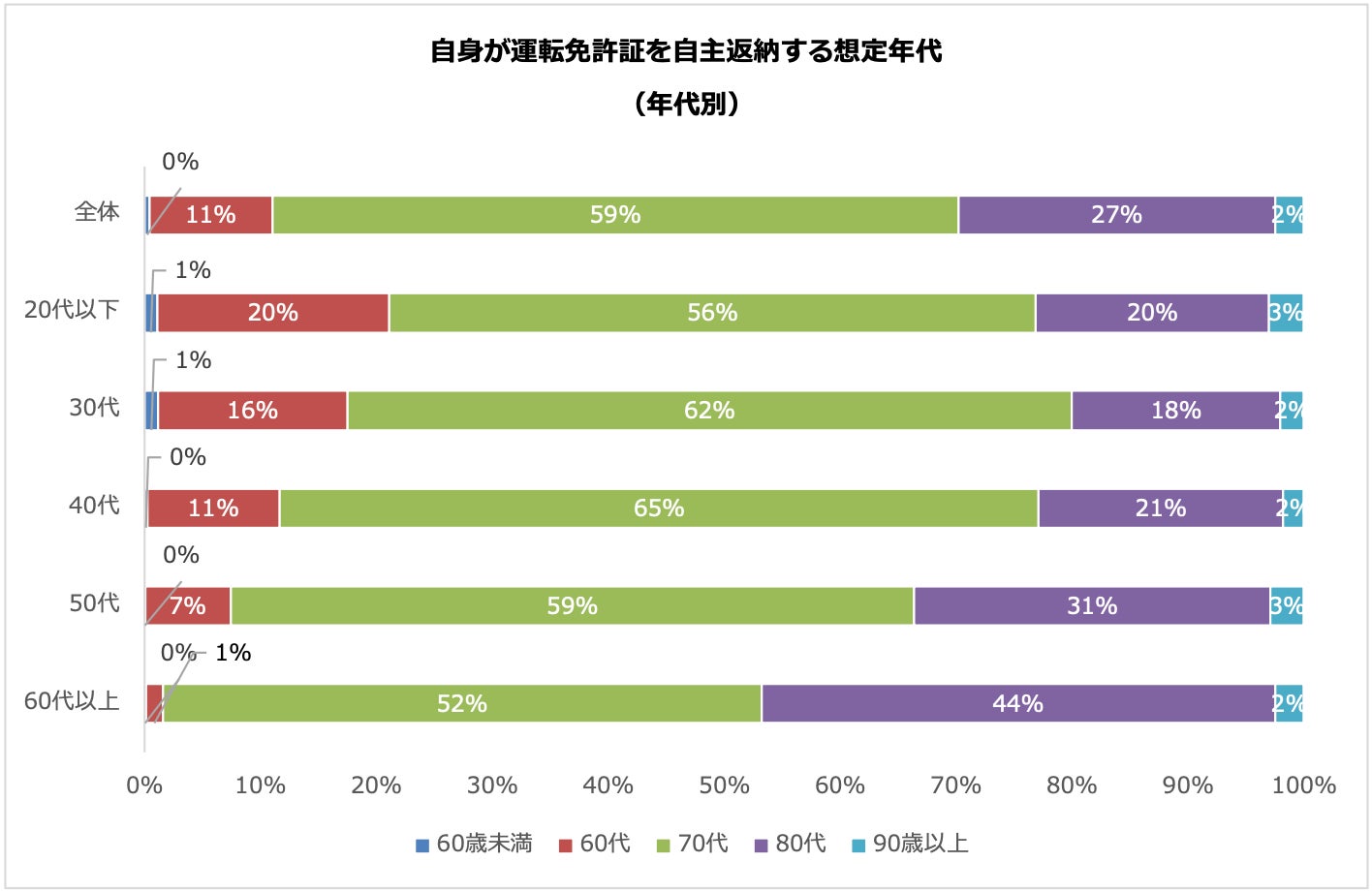 自身が運転免許証を自主返納すると思われる年代を尋ねたところ、「70代」59%が最も多く、次いで「80代」27%となりました。回答者の年代別で見ると、30代以上は全体と同じ傾向であったのに対し、20代以下は「60代」と「80代」が同率となりました。