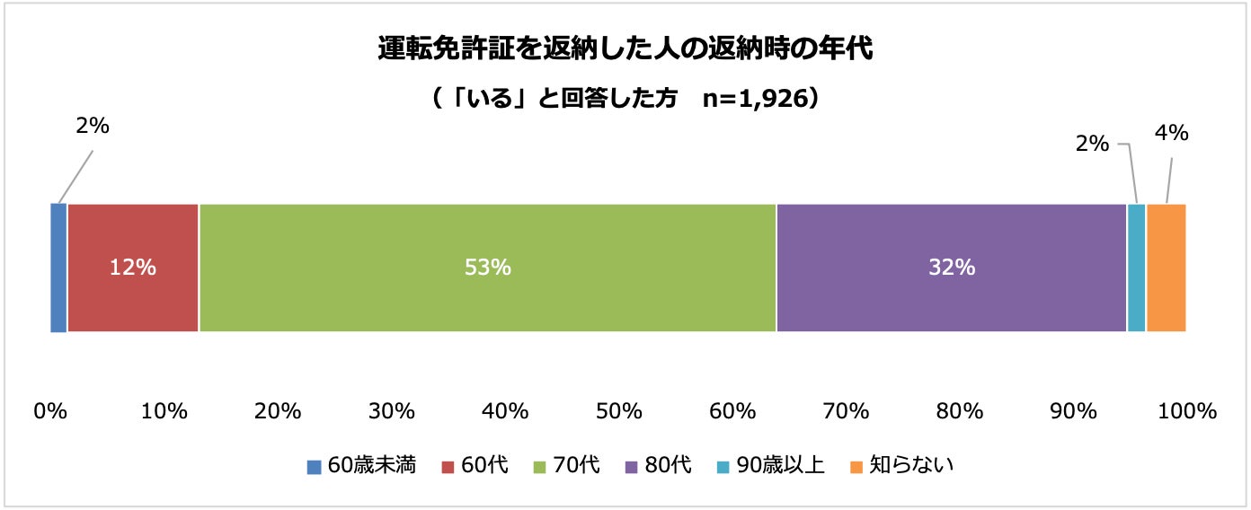 家族や親族、友人などで運転免許証を返納した人の年代は「70代」53%が最も多く、以降「80代」32%、「60代」12%と続き、「②運転免許証を自主返納する想定年代」とほぼ同じ傾向となりました。