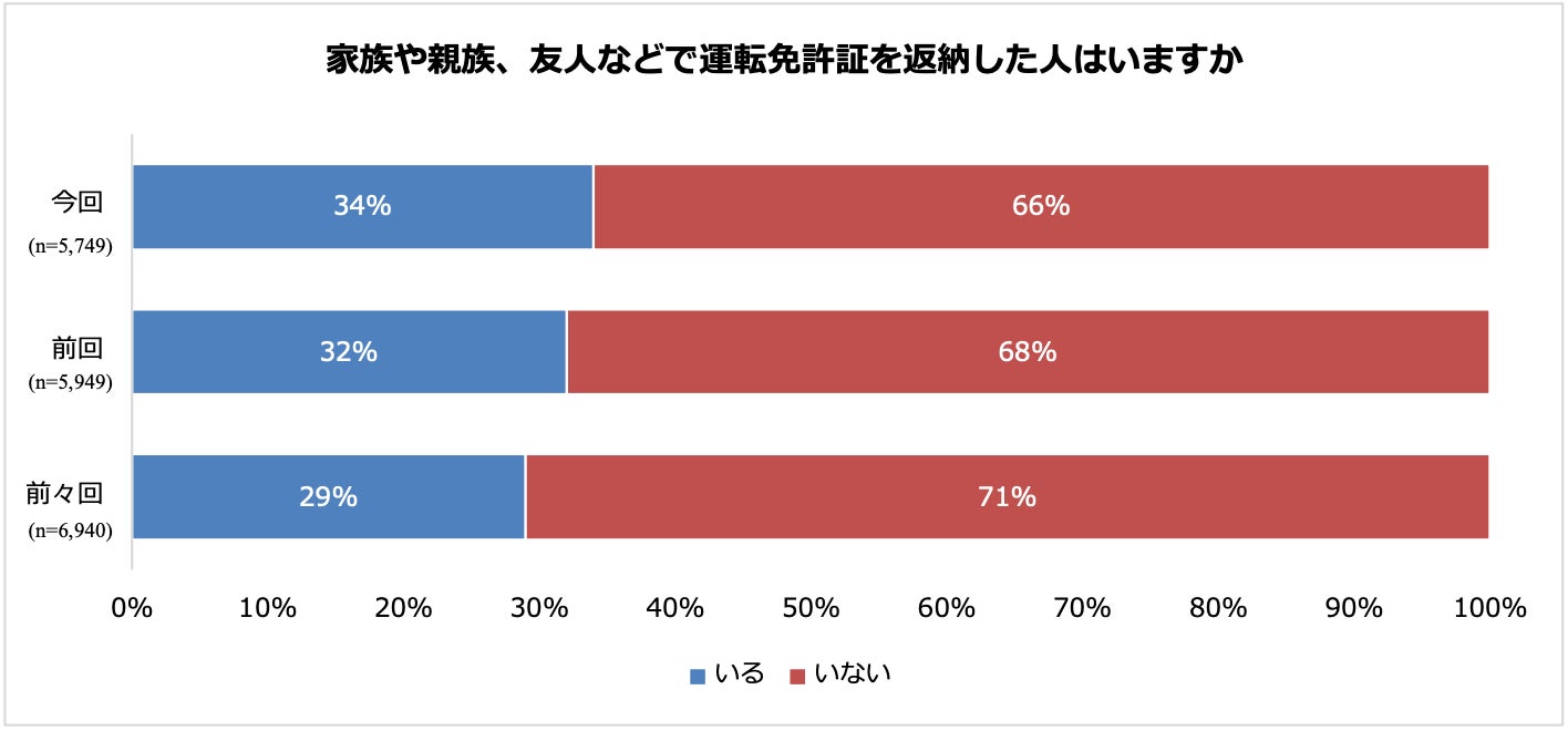家族や親族、友人などで自ら運転免許証を返納した人が「いる」と回答した人は34%でした。2022年から徐々に比率が上昇しています。