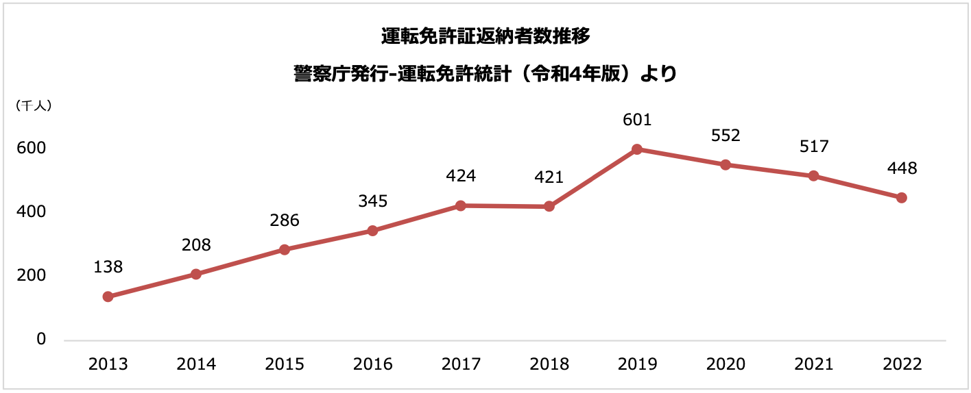 一方で、警察庁発行の「運転免許統計(令和4年版)」によると、運転免許証の自主返納者数は2019年までは増加傾向にあったものの、2020年以降は3年連続で減少しています。コロナ禍での密を避けた移動手段や、鉄道やバスなど公共交通が減少する環境下の代替移動手段としてクルマを活用せざるを得ない機会が増えたことや、クルマの運転支援機能が向上したことなど、様々な要因が考えられます。(出典:警察庁交通局 運転免許統計(令和4年版) https://www.npa.go.jp/publications/statistics/koutsuu/menkyo/r04/r04_main.pdf)
