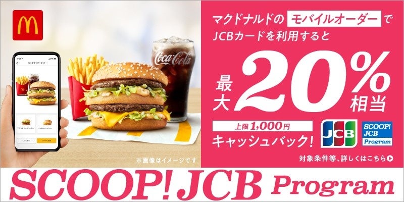 株式会社ジェーシービー (本社:東京都港区、代表取締役会長兼執行役員社長:浜川 一郎、以下:JCB) と日本マクドナルド株式会社(本社: 東京都新宿区、代表取締役兼CEO:日色 保)は、2022年7月15日(金)から8月21日(日)まで、「マクドナルドのモバイルオーダーでJCBカードを利用すると最大20%相当キャッシュバック!」キャンペーンを実施します。