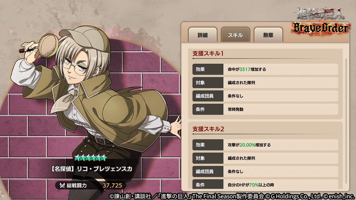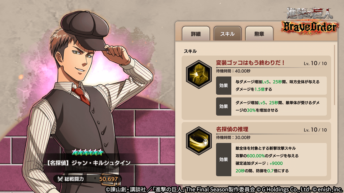株式会社enish(本社:東京都港区、代表取締役社長:安徳 孝平、以下enish)は、アニメ『進撃の巨人』のスマートフォンゲーム最新作「進撃の巨人Brave Order」にて、11月30日(水)より新イベント「夜闇に踊る怪紳士」を開催!イベントアイテムを集めて限定の「ベルトルトの衣装」を手に入れよう!また、本日より新登場の【怪盗】リヴァイ、【名探偵】ジャン・キルシュタイン、【名探偵】リコ・ブレツェンスカがピックアップされた「夜闇に踊る怪紳士ガチャ」も同時開催!その他、最新情報はゲーム公式サイト・ゲーム公式Twitterアカウントにて随時公開して行きますので、ぜひご覧ください。