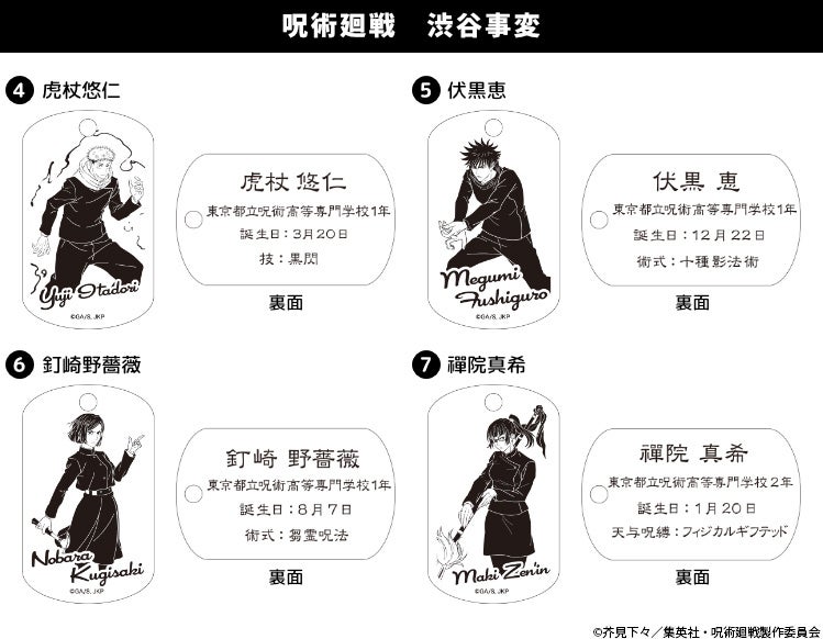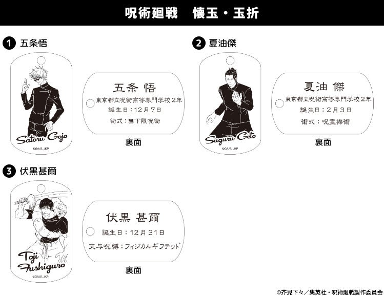 TVアニメ『呪術廻戦』第2期「懐玉・玉折」およびTVアニメ「呪術廻戦」のキャラクタービジュアルを使用した、アクセサリー感覚で持ち歩けるプレミアムドッグタグが登場