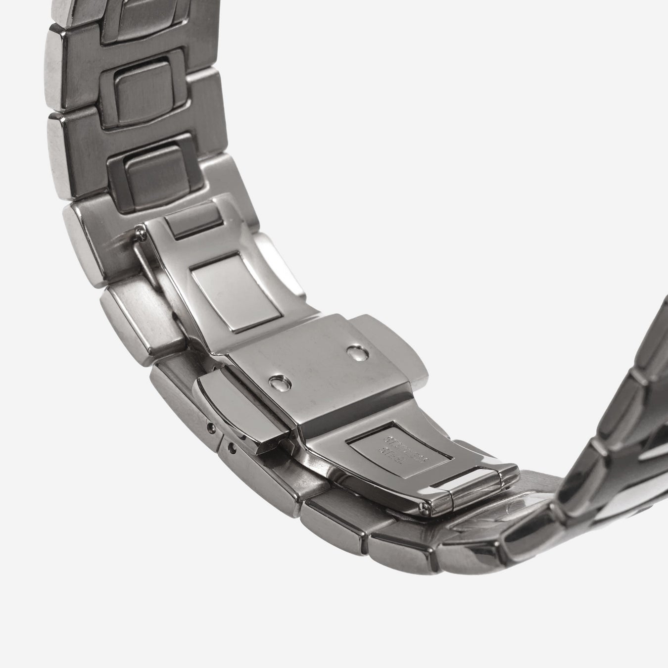 メインリンクにはブラスト加工を施し、洗練されたマットな質感を実現。一方で、内側のリンクは高光沢のポリッシュ仕上げが施されており、輝きと奥行きを演出しています。この異なる質感の組み合わせが、視覚的なバランスを生み出し、デザイン全体の強さと優雅さを一層引き立てています。