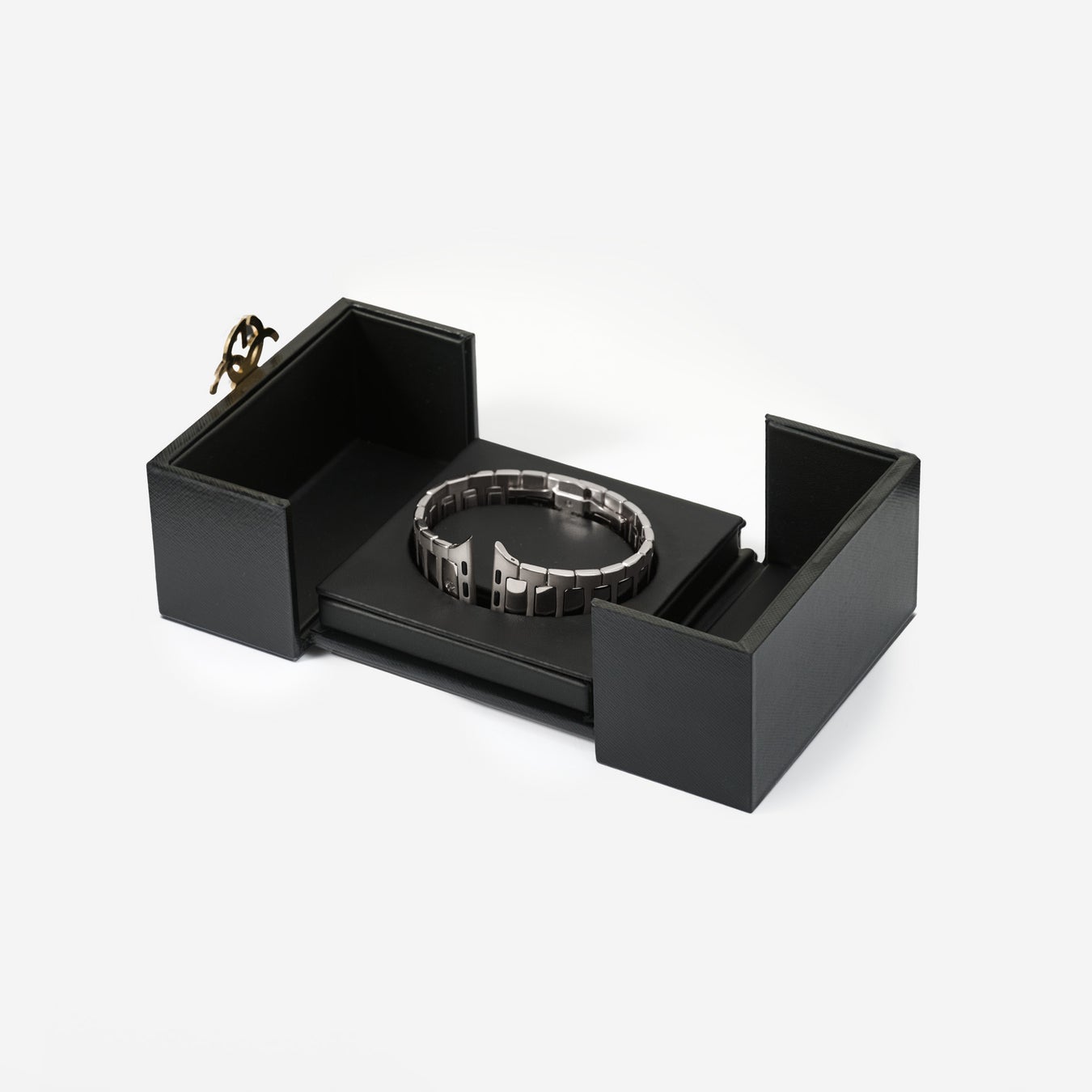 製品は、内装にブラックレザーを用いたハンドメイドのブラックオーク製ボックスに収められます。商品の魅力を最大限に引き出すために、開封構造にも工夫を凝らし、慎重にデザインしました。単なる包装物に留まらず、贅沢で魅力的な"開封体験"をお届けします。