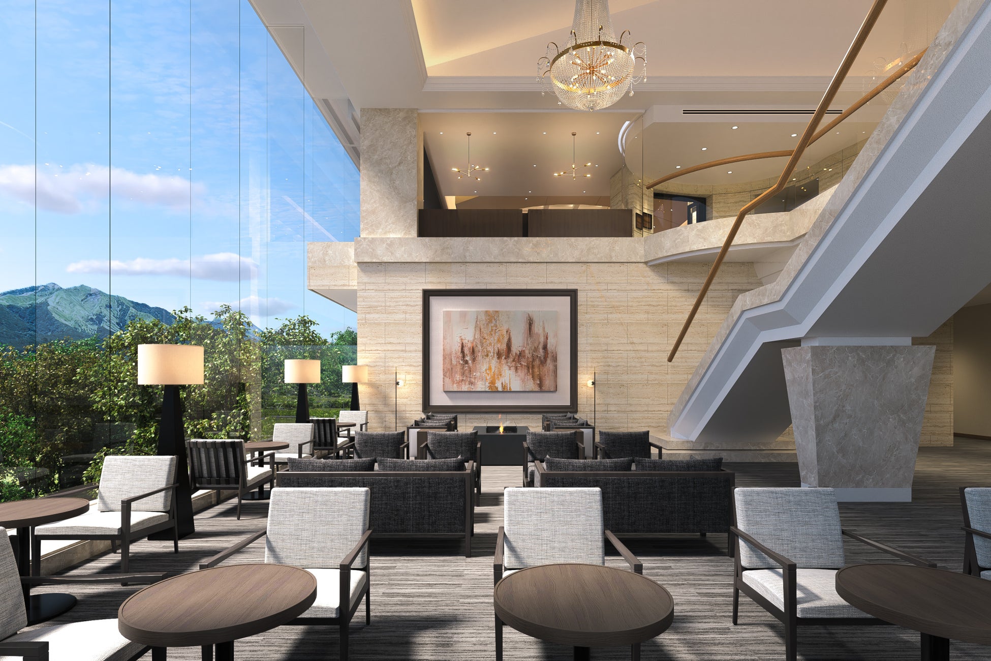 一歩足を踏み入れた瞬間、みなさまをお迎えするのが全面ガラス張りのラウンジ空間です。