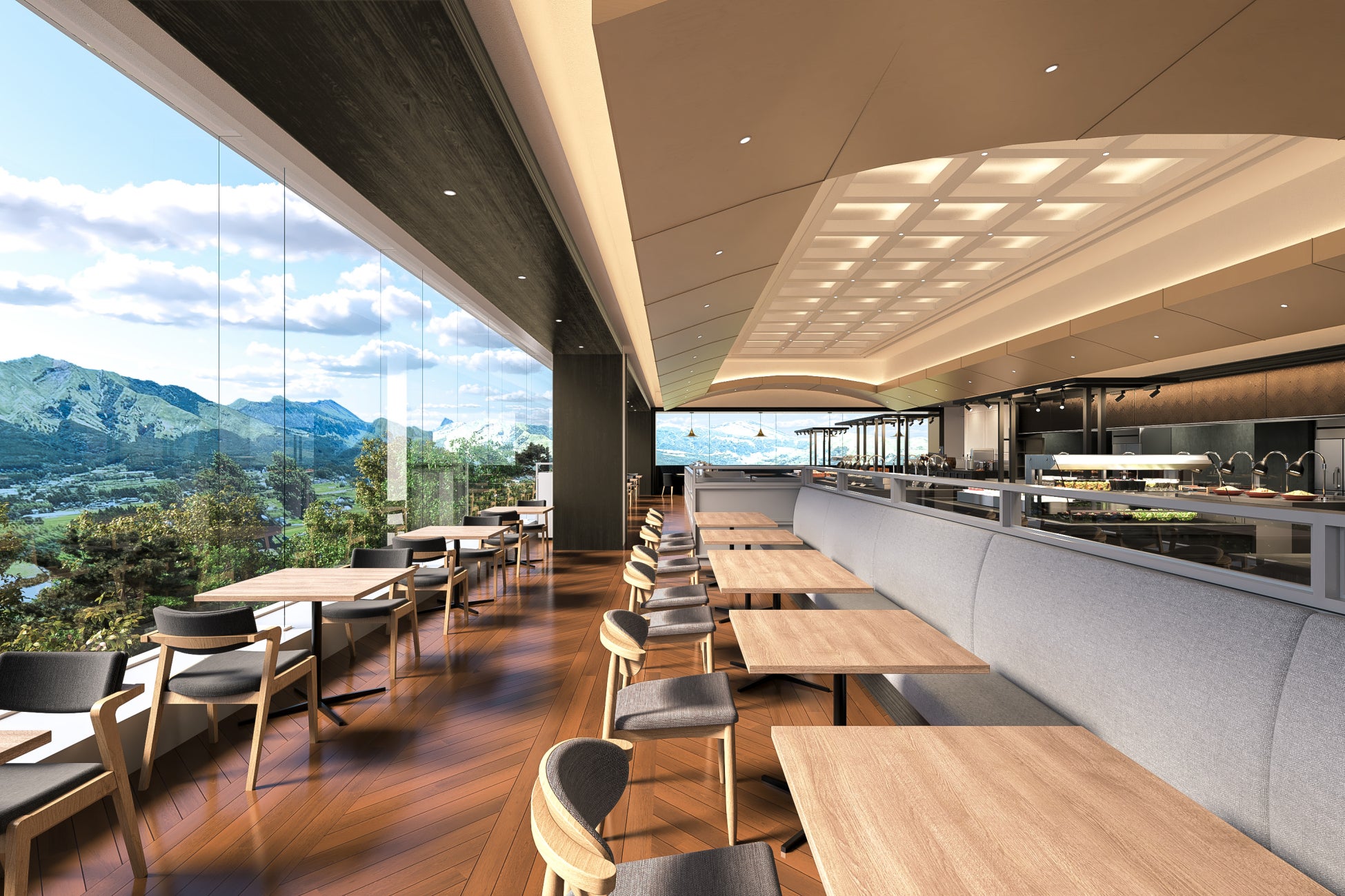 阿蘇五岳の雄大な景色を切り取るワイドガラス設計のレストランは、席に着いた瞬間から眺望をお楽しみいただける研ぎ澄まされた空間が広がります。