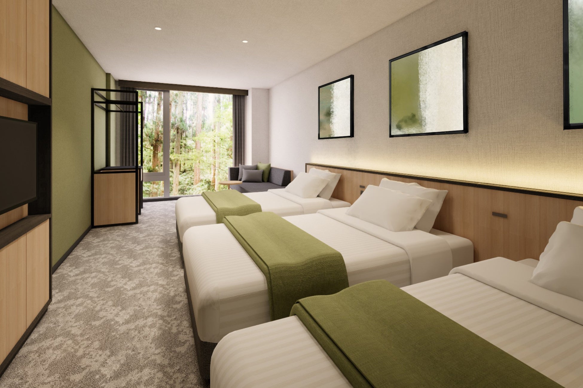 客室は、窓の外に広がる阿蘇の雄大な自然を心ゆくまで堪能できるよう設計されています。