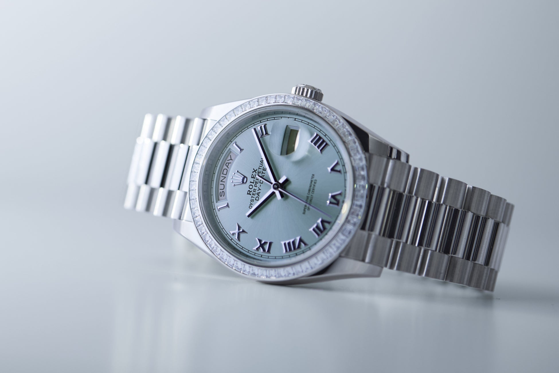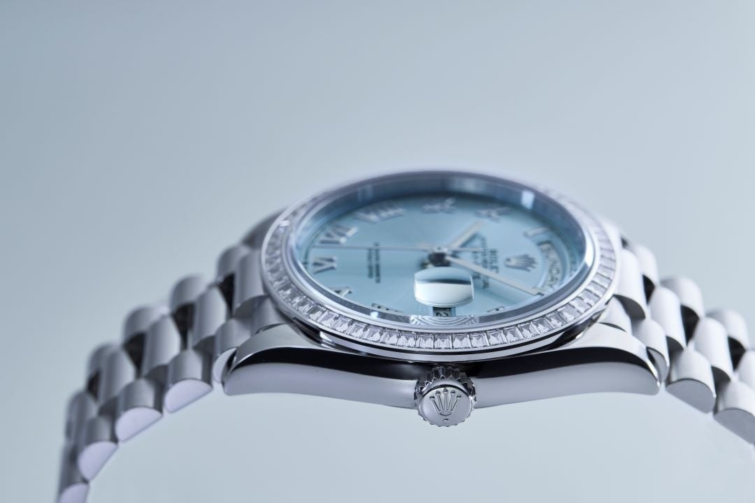 ロレックスにおけるハイエンドコレクションのデイデイト。貴金属でのみ展開され、フルスペルの曜日表示は唯一となる。アイスブルーダイヤルはロレックスのプラチナ製モデルにおいて特別で、デイデイト・コスモグラフデイトナ・パーペチュアル1908・ランドドゥエラーでのみ展開。ベゼルにはバゲットカットダイヤが施され、ラグジュアリーかつクールな世界観を纏っている。半円形の3列リンクプレジデントブレスレットが気品高い雰囲気をさらに引き立てている。