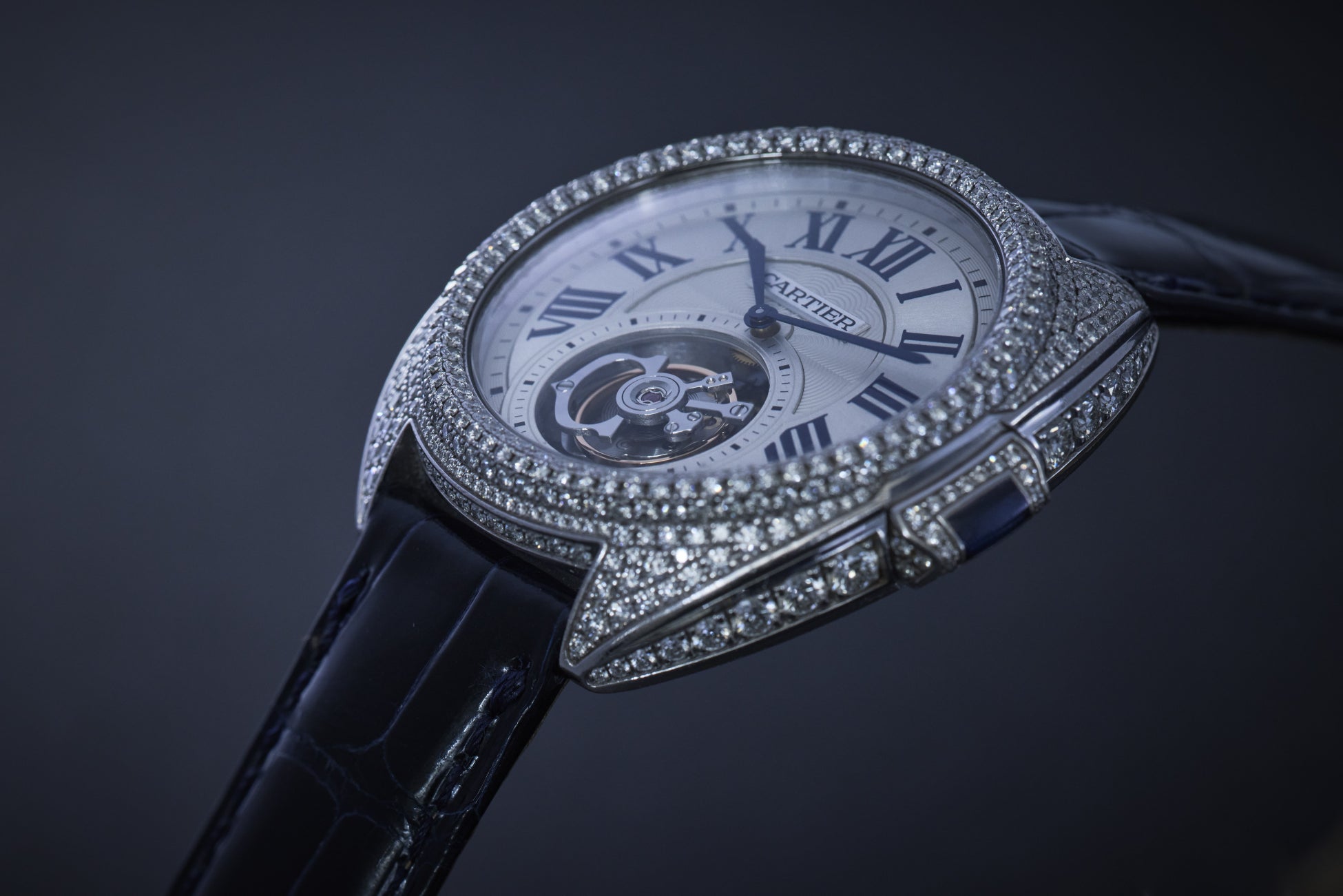 『クレ』とはフランス語で『鍵』を意味しており、角形のリューズが特徴のコレクション。ホワイトゴールドケースに478個、計3.56ctのブリリアントカットダイヤモンドを使用した豪華なモデル。6時位置のカルティエの「C」をかたどったケージを備えたフライングトゥールビヨン機構は、1分間に1回転することで、内部に組み込まれた脱進機のヒゲゼンマイやテンプが受ける重力の影響を最小限に抑えることに成功した。