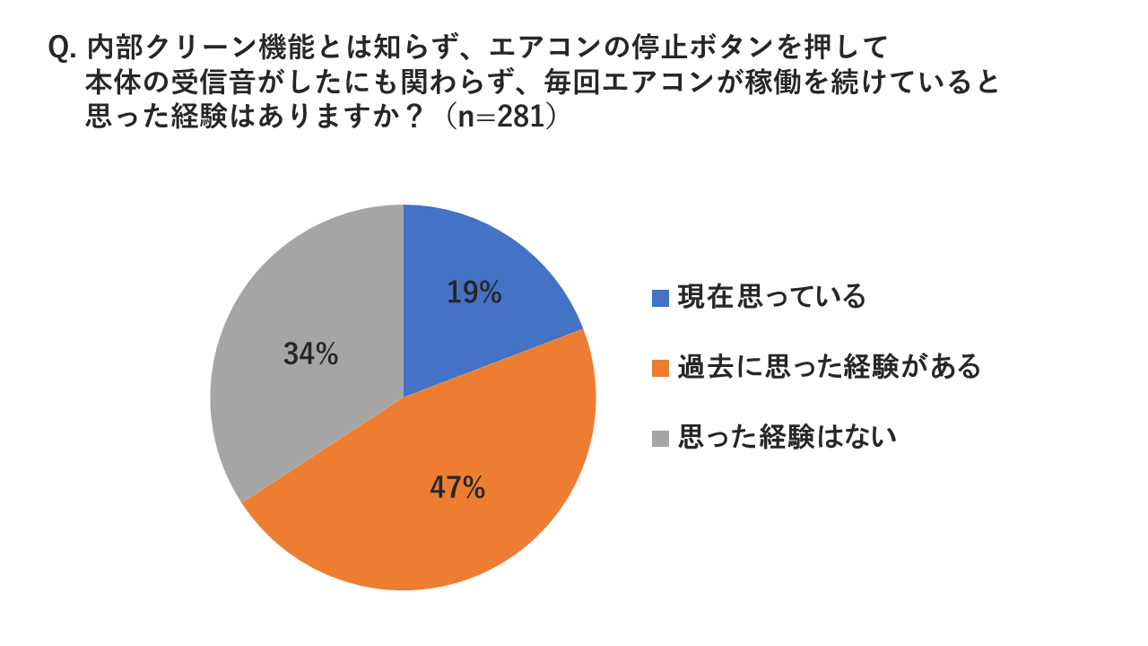 そこで、「内部クリーン機能」搭載機種ユーザーに、「エアコン停止ボタンを押したにも関わらず、毎回エアコンが稼働を続けている」と思った経験を聞いたところ、実に約7割の方が「現在思っている」「過去に思った経験がある」と回答をしました。